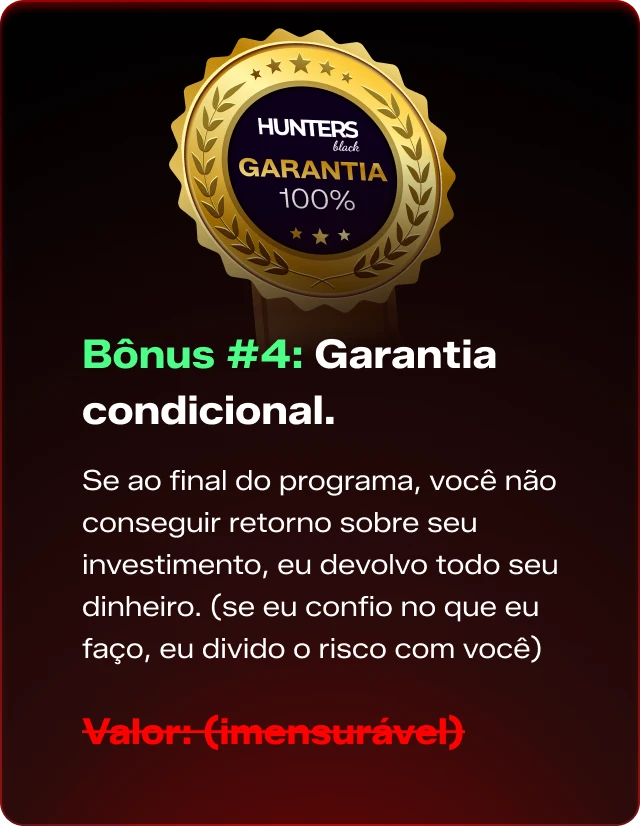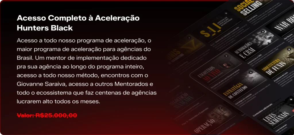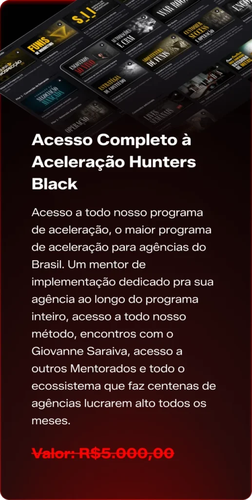 Eu sei como é estar aí. Faturando, mas sentindo que a empresa é uma prisão. Eu construí a Hunters Black não para ser mais um curso, mas para ser o ambiente onde donos de agência tomam a decisão de virar o jogo.